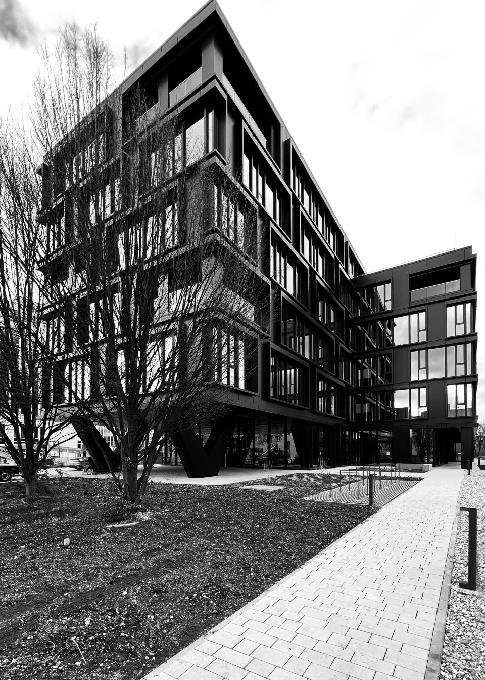 The shell is a reinforced concrete construction, the facade made of glass and a slender frame construction of black powder-coated metal. The ground floor, divided into three sections, is glazed, emphasising openness and transparency. The first area houses the lounge and reception, the next the conference spaces and offices, and the third houses the catering area. On the ground floor, the architecture with its triadic structure can be crossed at two points - on foot, by scooter or bicycle.